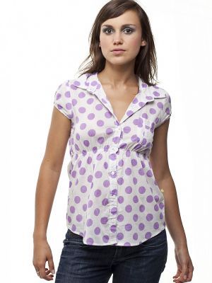 Damska bluzka z przewiewnego materiału w kolorze fioletowym w białe kropki. Rękawki wykończone gumkami, pod biustem wszyta gumka. Na piersi niewielka kieszonka.